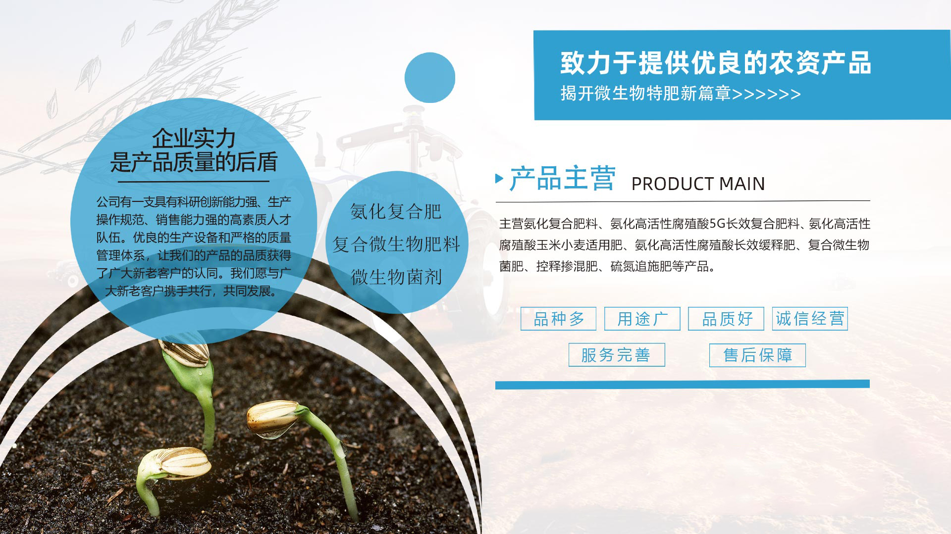 湖北美可美化工有限公司主要生产氨化复合肥、复合微生物肥料、有机无机、微生物菌剂等高浓度肥料与微生物精细化产品融合的新型特种肥料。